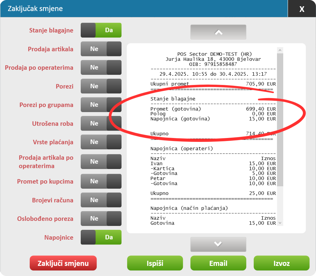 Slika 4. Zakljucak smjene u kojem je prikazan iznos napojnica
