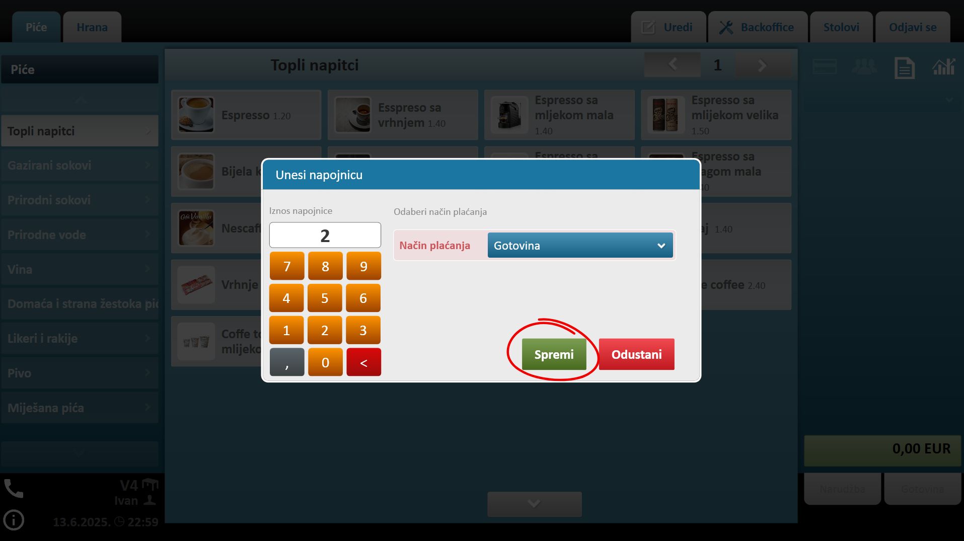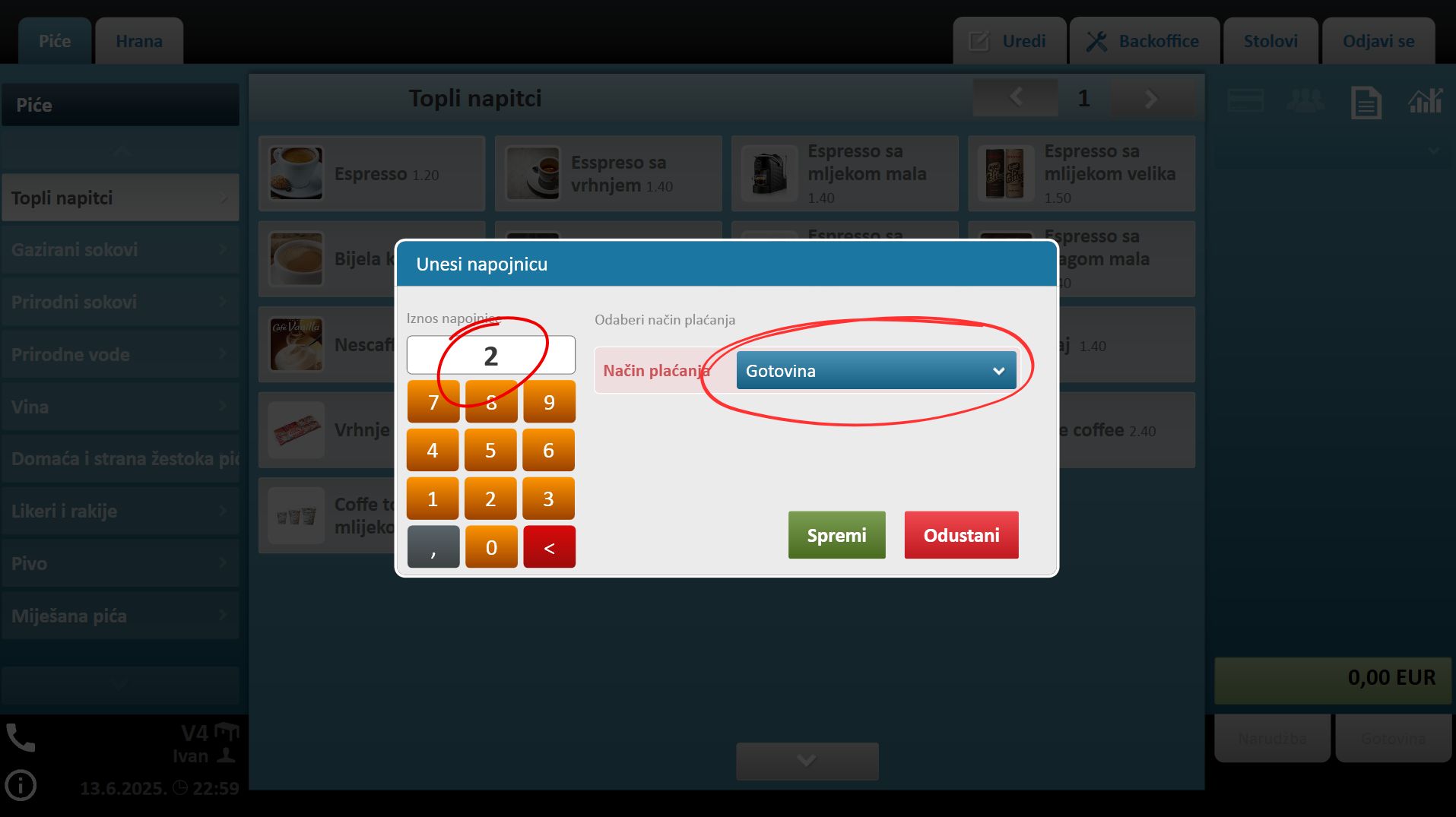 4. Unesite iznos napojnice i u padajućem meniju pored, odaberite način njenog plaćanja.